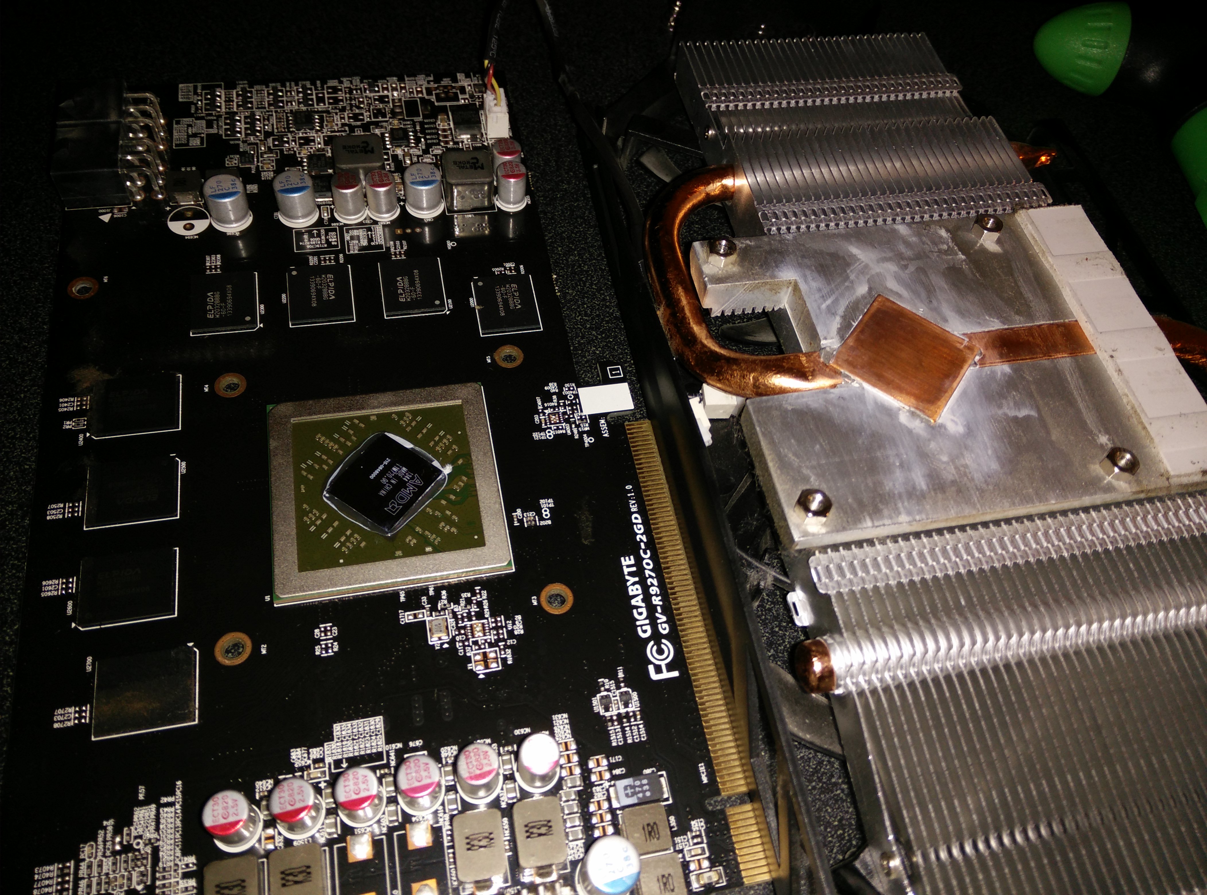 I noticed temperatures were reaching near 90 degrees Celsius while running furmark for 20 minutes. So I decided to open it, clean it, and put some Arctic Silver 5 thermal paste. This dropped the temperatures to 80 while running furmark and while gaming, it is usually in the 60-70 degree range. See the pictures below for how it looks inside. All I had to do was remove the 4 screws on the bottom and the whole heatsink came off easily. I then used isopropyl alcohol and Q-tips to clean it.
